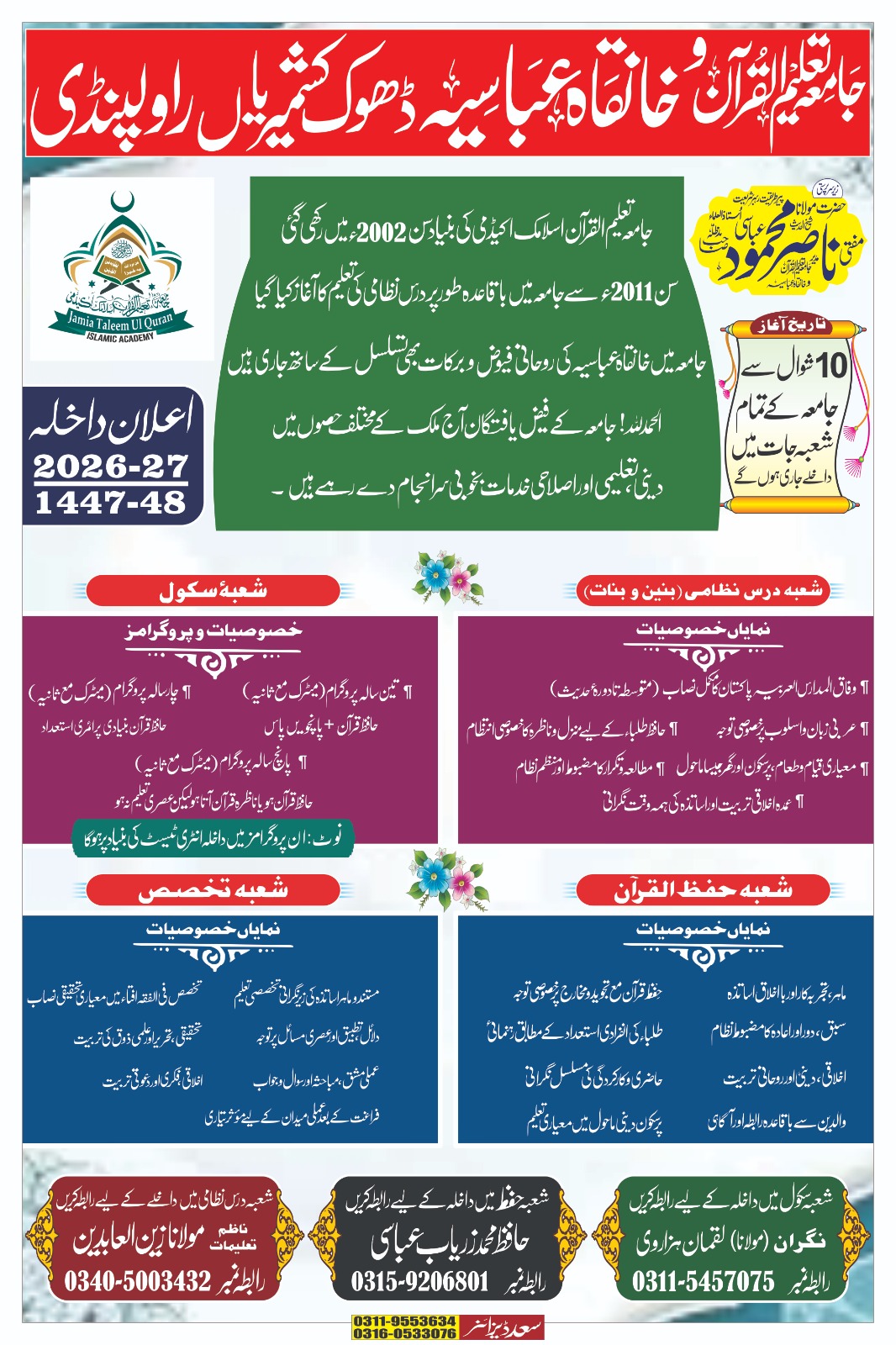 جامعہ تعلیم القرآن اسلامک اکیڈمی ایک دینی و تعلیمی ادارہ ہے جس کی بنیاد 2002ء میں رکھی گئی۔ اس ادارے کا مقصد قرآن و سنت کی تعلیمات کو فروغ دینا اور طلبہ کی علمی و اخلاقی تربیت کرنا ہے۔2011ء سے جامعہ میں باقاعدہ طور پر درسِ نظامی کی تعلیم کا آغاز کیا گیا، جہاں طلبہ کو قرآن، حدیث اور دیگر اسلامی علوم کی تعلیم دی جاتی ہے۔ جامعہ میں خانقاہِ عباسیہ کے روحانی فیوض و برکات کا سلسلہ بھی جاری ہے جس سے طلبہ کی روحانی و اخلاقی تربیت کا بھی اہتمام کیا جاتا ہے۔الحمدللہ، جامعہ کے فارغ التحصیل طلبہ ملک کے مختلف حصوں میں دینی، تعلیمی اور اصلاحی خدمات انجام دے رہے ہیں۔